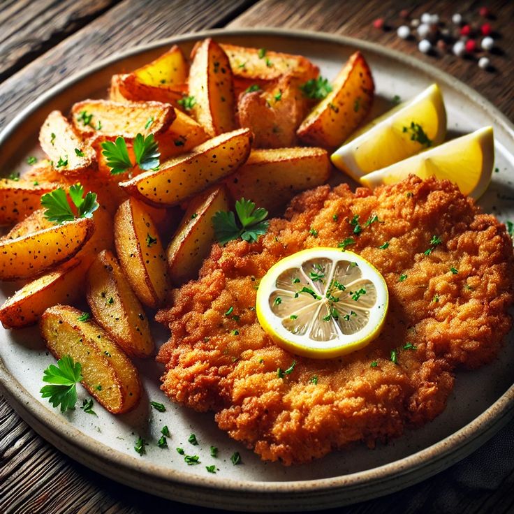 Classic breaded veal cutlet, pan-fried until golden brown, traditionally served with lemon wedges and potato salad.