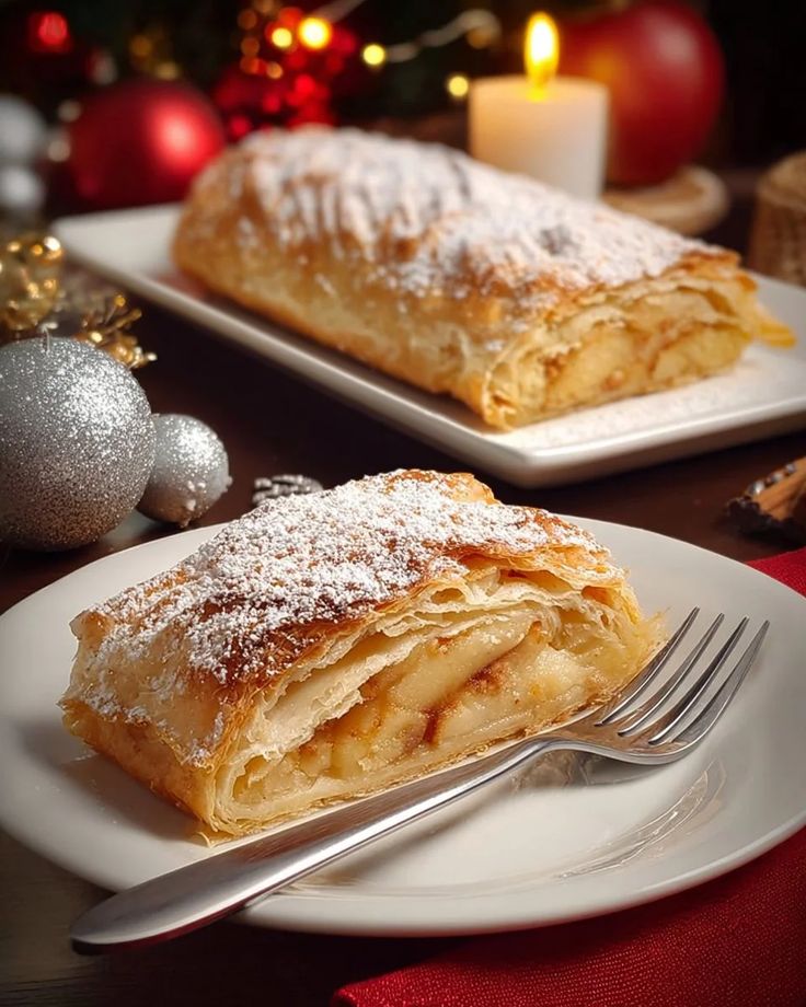 Flaky pastry rolled around slices of apples, cinnamon, and raisins—served hot with whipped cream.